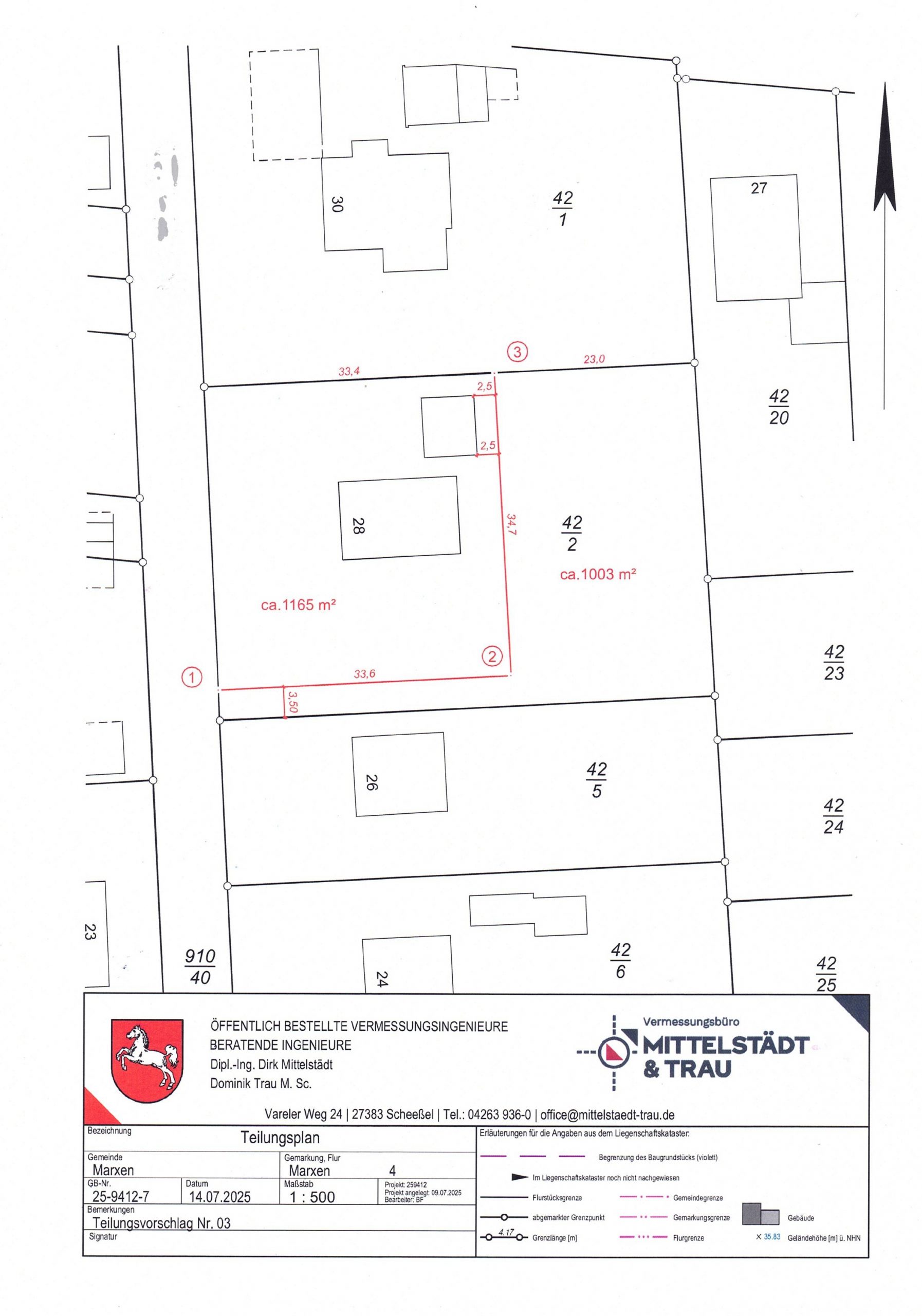 Das sonnige und vielseitig nutzbare Grundstück ist in absolut ruhiger und gewachsener Wohnlage gelegen. Es ist beabsichtigt, das derzeit wesentlich größere Grundstück gemäß dem beigefügten Teilungsplan real zu teilen. Das Grundstück ist vollerschlossen, Versorgungsleitungen für Wasser/Abwasser, Strom und Gas sind in der Straße vorhanden. Der Bebauungsplan der Gemeinde Marxen (Bebauungsplan – „Dorf“) sieht an dieser Stelle die Bebauung mit einer GRZ von 0,15 bei einer Mindestgröße von 500m² Grundstücksfläche pro Wohneinheit vor. Weiterhin ist die Errichtung von Carports, Garagen und Nebenanlagen zulässig. Weitere, konkrete baurechtliche Fragen sind mit dem Bauamt in Winsen und der Gemeinde Marxen abzustimmen. Die erforderliche Grundstücksaufbereitung (z.B. Herstellen der Zufahrt durch Fällen von Bäumen u. Entfernen von Strauchwerk, die Beantragung einer neuen Zufahrt, etc.) ist, mit Ausnahme der Grundstücksteilung, Sache eines Käufers. Gern zeigen wir Ihnen dieses tolle Grundstück und erläutern Ihnen hierzu weitere Details in einem ersten persönlichen Gespräch.