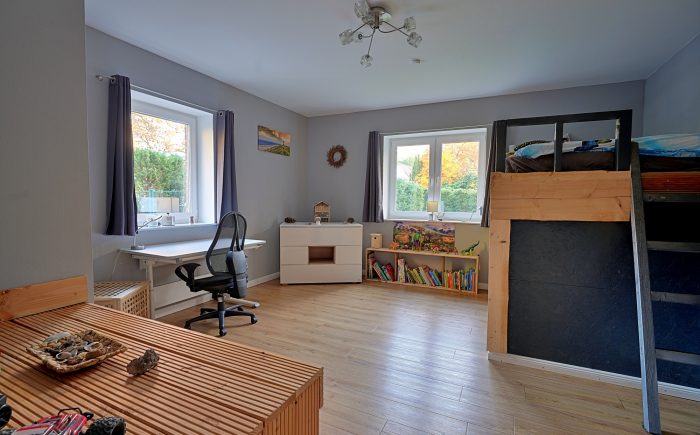 Das moderne Einfamilienhaus wurde im Jahr 2012 in konventioneller Bauweise auf einem 1.287m² großen und teilweise terrassenartig angelegten Grundstück errichtet. Die weitläufige und traumhafte Gartenanlage wurde liebevoll angelegt und bietet viel Raum für Entspannung und Erholung. Eine perfekte Kombination aus ländlicher Idylle und modernem Wohngefühl – ideal für alle, die Stil, Komfort und Natur gleichermaßen schätzen. Rund um das Haus wurden Pflasterarbeiten getätigt. Die ca. 145m² Wohnfläche des Hauses verteilen sich auf 3,5 Zimmer, zwei Bäder und einen Hauswirtschaftsraum. Im Erdgeschoss lädt der großzügige Wohn-Essbereich mit Kamin und direktem Zugang zur Terrasse zum Verweilen ein. Der offene Grundriss sorgt in Kombination mit einer Vielzahl von Fensterflächen für ein helles und freundliches Ambiente. Die Einbauküche bietet viel Platz zum Vorbereiten, Kochen und Abstellen und fügt sich stilvoll in das Gesamtkonzept ein. Ein geräumiges Kinder-, Gäste- oder Arbeitszimmer sowie ein modern gestaltetes Duschbad runden die tollen Gegebenheiten des Erdgeschosses ab. Über eine weiß lackierte und offene Holztreppe gelangt man ins das individuell gestaltetet Dachgeschoss. Hinter der rechten Tür verbirgt sich der praktische Hauswirtschaftsraum mit Platz für Waschmaschine und Trockner betreten. Eine Gaube verleiht dem Raum viel Tageslicht. Angrenzend befindet sich ein großzügig gestaltetes Schlafzimmer mit begehbarem Kleiderschrank. Das ansprechende Vollbad mit „Whirlpoolwanne“ vereint Design mit Wohlfühlatmosphäre. Ergänzt wird sie durch eine separate Dusche mit Glasabtrennung, die Komfort und Funktionalität perfekt verbindet. Ein weiteres Zimmer bietet Platz für Arbeiten, Hobby oder Gäste. Der großzügige Terrassenbereich lädt mit seiner sonnigen Ausrichtung und dem herrlichen Blick ins Grüne zum Entspannen ein. Herzstück ist ein beheizbarer Pool mit Gegenstromanlage, der zu jeder Jahreszeit Badevergnügen bietet. Das separate Saunahäuschen ergänzt den Bereich um eine exklusive Wellnesskomponente. Die Erwärmung und Warmwasseraufbereitung des Hauses erfolgt über eine Gasbrennwertheizung, die Warmwasseraufbereitung wird durch Solarthermie unterstützt. Im gesamten Haus ist eine Fußbodenheizung installiert. Die Errichtung eines Doppelcarports ist baurechtlich möglich. Eine genaue Raumaufteilung entnehmen Sie bitte den beigefügten Grundrissen.