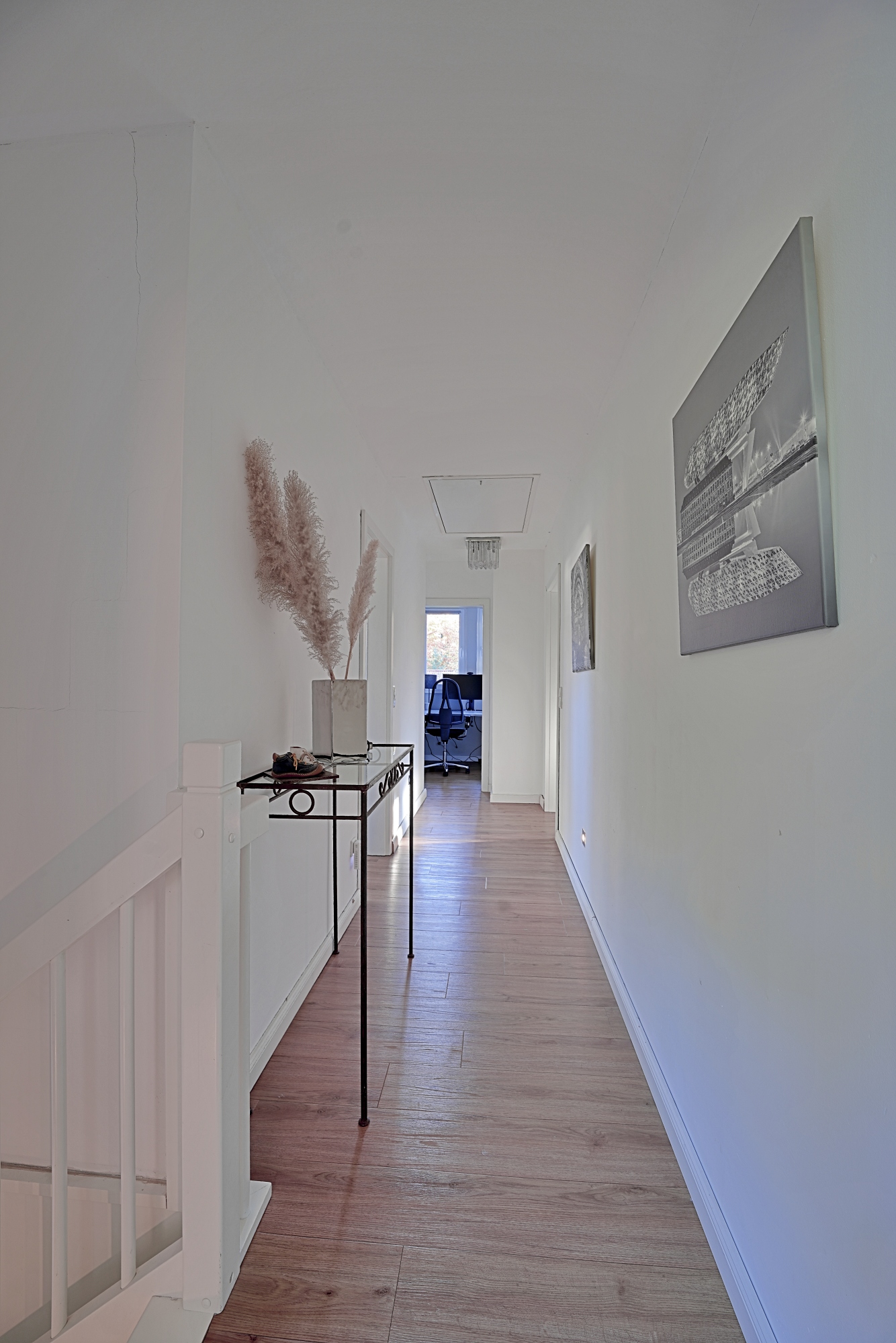Das moderne Einfamilienhaus wurde im Jahr 2012 in konventioneller Bauweise auf einem 1.287m² großen und teilweise terrassenartig angelegten Grundstück errichtet. Die weitläufige und traumhafte Gartenanlage wurde liebevoll angelegt und bietet viel Raum für Entspannung und Erholung. Eine perfekte Kombination aus ländlicher Idylle und modernem Wohngefühl – ideal für alle, die Stil, Komfort und Natur gleichermaßen schätzen. Rund um das Haus wurden Pflasterarbeiten getätigt. Die ca. 145m² Wohnfläche des Hauses verteilen sich auf 3,5 Zimmer, zwei Bäder und einen Hauswirtschaftsraum. Im Erdgeschoss lädt der großzügige Wohn-Essbereich mit Kamin und direktem Zugang zur Terrasse zum Verweilen ein. Der offene Grundriss sorgt in Kombination mit einer Vielzahl von Fensterflächen für ein helles und freundliches Ambiente. Die Einbauküche bietet viel Platz zum Vorbereiten, Kochen und Abstellen und fügt sich stilvoll in das Gesamtkonzept ein. Ein geräumiges Kinder-, Gäste- oder Arbeitszimmer sowie ein modern gestaltetes Duschbad runden die tollen Gegebenheiten des Erdgeschosses ab. Über eine weiß lackierte und offene Holztreppe gelangt man ins das individuell gestaltetet Dachgeschoss. Hinter der rechten Tür verbirgt sich der praktische Hauswirtschaftsraum mit Platz für Waschmaschine und Trockner betreten. Eine Gaube verleiht dem Raum viel Tageslicht. Angrenzend befindet sich ein großzügig gestaltetes Schlafzimmer mit begehbarem Kleiderschrank. Das ansprechende Vollbad mit „Whirlpoolwanne“ vereint Design mit Wohlfühlatmosphäre. Ergänzt wird sie durch eine separate Dusche mit Glasabtrennung, die Komfort und Funktionalität perfekt verbindet. Ein weiteres Zimmer bietet Platz für Arbeiten, Hobby oder Gäste. Der großzügige Terrassenbereich lädt mit seiner sonnigen Ausrichtung und dem herrlichen Blick ins Grüne zum Entspannen ein. Herzstück ist ein beheizbarer Pool mit Gegenstromanlage, der zu jeder Jahreszeit Badevergnügen bietet. Das separate Saunahäuschen ergänzt den Bereich um eine exklusive Wellnesskomponente. Die Erwärmung und Warmwasseraufbereitung des Hauses erfolgt über eine Gasbrennwertheizung, die Warmwasseraufbereitung wird durch Solarthermie unterstützt. Im gesamten Haus ist eine Fußbodenheizung installiert. Die Errichtung eines Doppelcarports ist baurechtlich möglich. Eine genaue Raumaufteilung entnehmen Sie bitte den beigefügten Grundrissen.